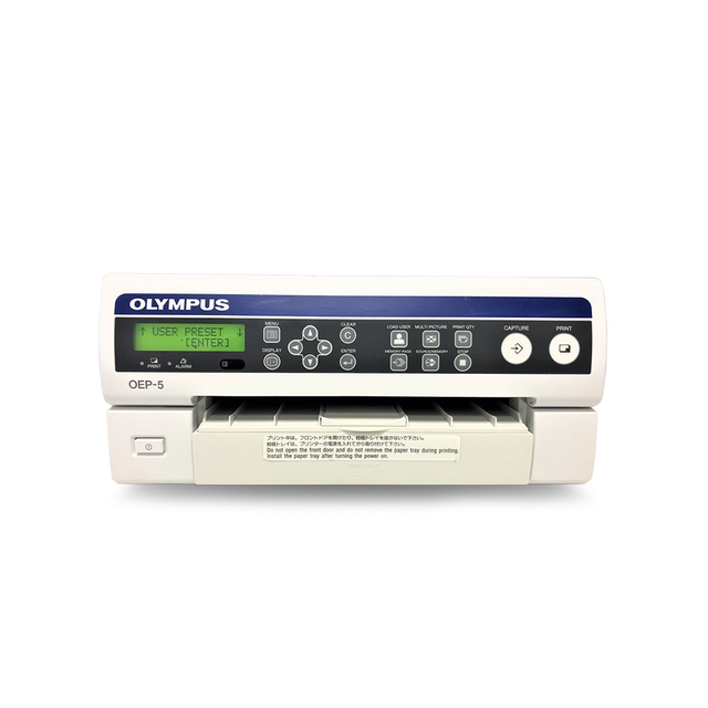 The Olympus OEP-5 Color Video Printer is a high definition medical grade color video printer for use in different clinical applications. For example, it can be used for printing of endoscopic images in line with Olympus endoscopes, video system centers, camera consoles, and endoscopic ultrasound systems. It can deliver high definition printing at 379 dpi resolution with excellent color reproduction from HDTV, SDTV, and SDI signals. Regarding its speed, it can normally print an A5 size image at 29 seconds per sheet. In its high speed printing mode, it only takes 21 seconds to print an A5 size sheet. In addition, it allows the printing of an image into a full sheet or a combination of 2, 3, or 4 images in a single sheet.