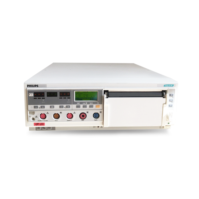 Philips 50XM Maternal/Fetal Monitor is able to monitor vital signs of both mother and fetus continuously during labor, delivery, and in antepartum testing-areas. It features Individual twins heart rate monitoring and uterine activity calculation. It has color-coded sockets matching cables and supplies, and even its fetal heart rate channels have their signal quality indicators. This device has Toco and intrauterine pressure monitoring and monitoring non-invasive measurement of the Noninvasive Blood Pressure and the Oxygen Saturation optional parameters. With its Cross Channel Verification feature, it can differentiate each twin and monitor their individual heart rates, and can differentiate mother from fetus. It has connectivity with the Avalon Cordless Transducer System and OB TraceVue, allowing patient surveillance, alerting, documentation, archiving functionality, and easy access to well-organized patient data. With this TraceVue system, patient name and bed labeling are harmonized and the system clock is synchronized with the monitors.
