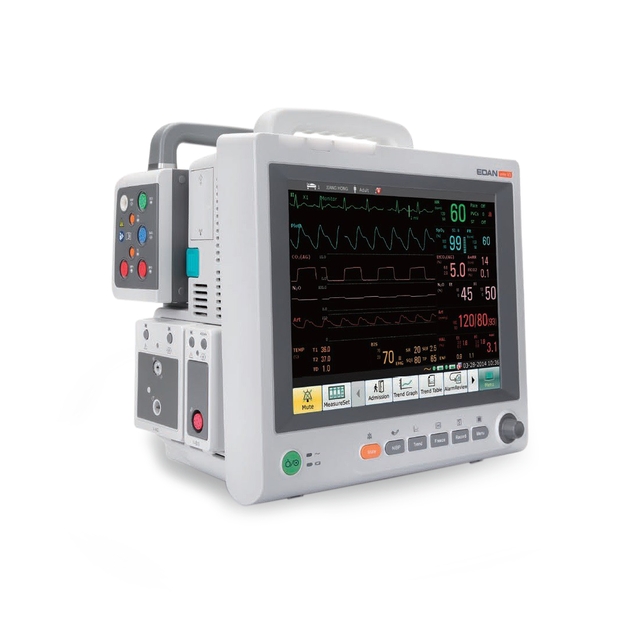Edan Elite V5 patient monitor is suitable for critical care environments such as ICUs, anesthesia monitoring, and operating rooms. It is a fan-less model making it a low consumption monitor, keeping noise level at minimum. It has a 12.1 high-resolution color TFT LCD touchscreen with customizable shortcuts and one-touch access operations. It has defibrillation protection and synchronization, pacemaker detection, and electrosurgical interference proof. Parameters and waveforms are easily adjusted and edited with its touch and configure feature. It has optional parameters including 12-lead ECG, Nellcor OxiMaxTM SpO2,OMRON NIBP, 8-IBP, C.O., Respironics CO2 (Mainstream and Sidestream), PHASEIN Anesthesia Gas/O2, BISNEW. It can connect and interact with hospital networks with its HL7 and LAN/WIFI compatibility. It has a SEMIP 12-lead diagnosis algorithm with 208 kinds of analysis results and a unique iSEAPTM ECG algorithm for enhanced care for arrhythmia patients. It has a barcode scanner that allows patient data to be read directly from their wristband.