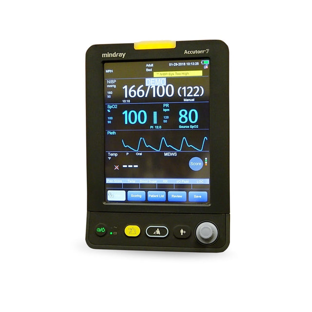 Mindray Datascope Accutorr 7 is an all-around monitor that houses an 8.4-inch back-lit high-res TFT display touchscreen, providing easy access to patient information. Its various optional parameters include SpO2 technology of user's choice between Masimo SET or Nellcor Oximax, NIBP that is either manual or automatic, MEWS for vital clinical decision support, low flow sidestream CO2 measurements of FiCO2, etCO2, and awRR with a CO2 waveform, and temperature measurement with either Mindray SmarTemp or Welch Allyn SureTemp Plus. The Accutorr 7 is capable of storing up to 5000 measurements and it uses patient ID technology for accessing data. It also has an optional bar code scanner for faster patient identification. It has a clinician identification technology in the form of Mindray MLDAP Server which can be linked to the facility? Active Directory (AD) for a more secure patient monitoring. The Accutorr 7? Mindray BeneVision Central Station allows central monitoring of patients and the Accutorr 7 also supports nurse call interface.