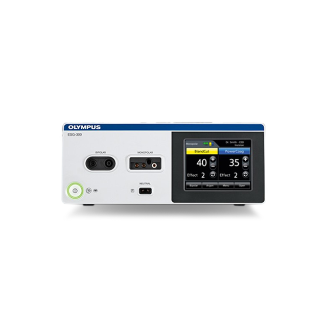 Olympus ESG-300 is a high-end HF generator that caters to the surgical needs of advance gastrointestinal and respiratory procedures. It has a simple touch-screen feature that allows users to setup the system according to their needs. It has a wireless footswitch that allows easy toggling of system settings without directly interacting with the generator. The device has a broad 29-language selection system. It can be used with the Argon Plasma Unit 300.