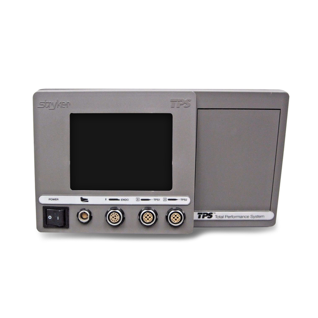 The Stryker TPS Instrument Console powers handheld surgical instruments used for cutting, drilling, decorticating, and smoothing of bone and other bone related tissue in a variety of surgical procedures. The console allows complete control over the connected handpieces, the optional footswitches and irrigation pump, during procedures. Its intuitive touchscreen interface enhances efficiency by providing quick access to system settings while the console operates multiple connected handpieces and footswitches simultaneously. The console will also conveniently display the options related only to the connected handpiece, and this saves time for the user by eliminating unnecessary menu options. In addition, it is also equipped with an integral irrigation pump system with adjustable flow rates. The Stryker TPS Instrument Console is also used for the placement or cutting of screws, wires, pins, and other fixation devices as its handpieces can be used to cut metal.