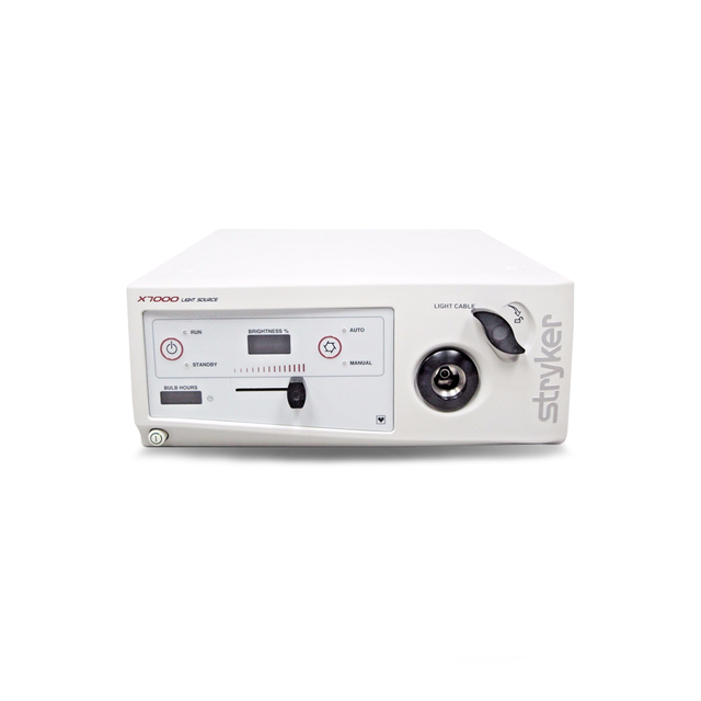 The Stryker X7000 220-190-000 Light Source provides ambient light to surgical sites of minimally invasive endoscopic procedures. Its 300-watt Xenon bulb is optimized to work with High Definition systems, delivering light via a fiberoptic cable. It is built to meet the demands of progressive scan technology, and is compatible with Stryker 1088, 1188, and 1288 digital imaging systems.